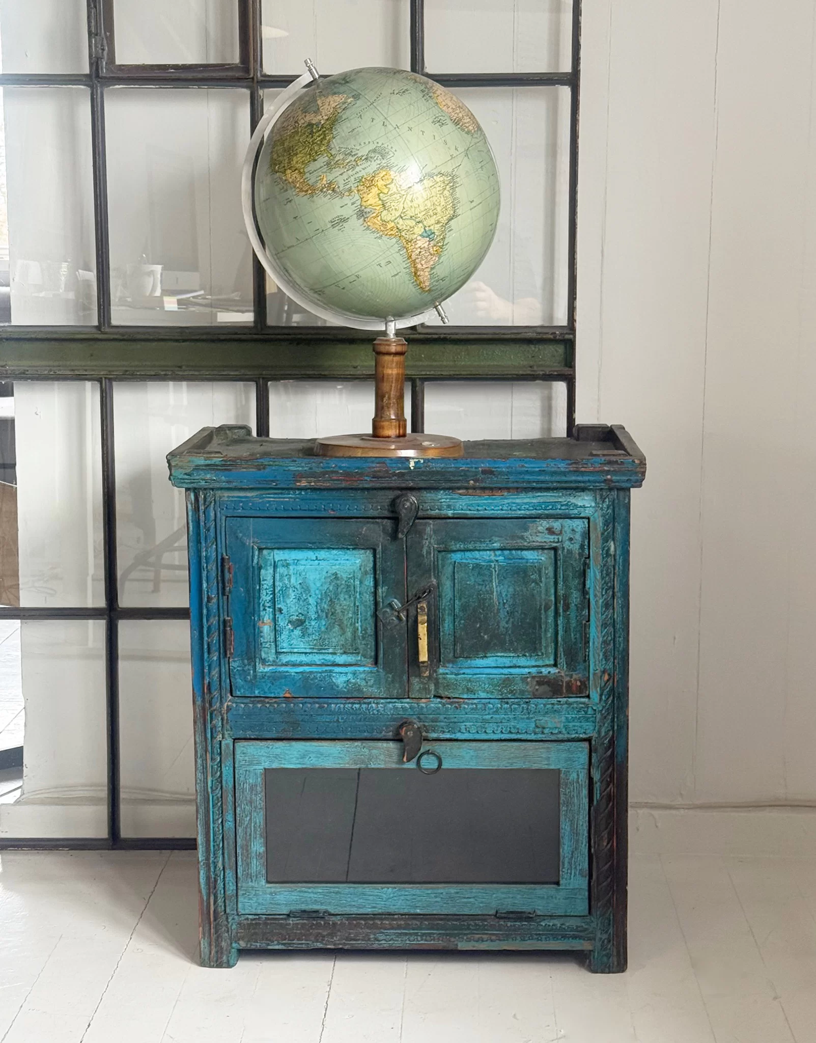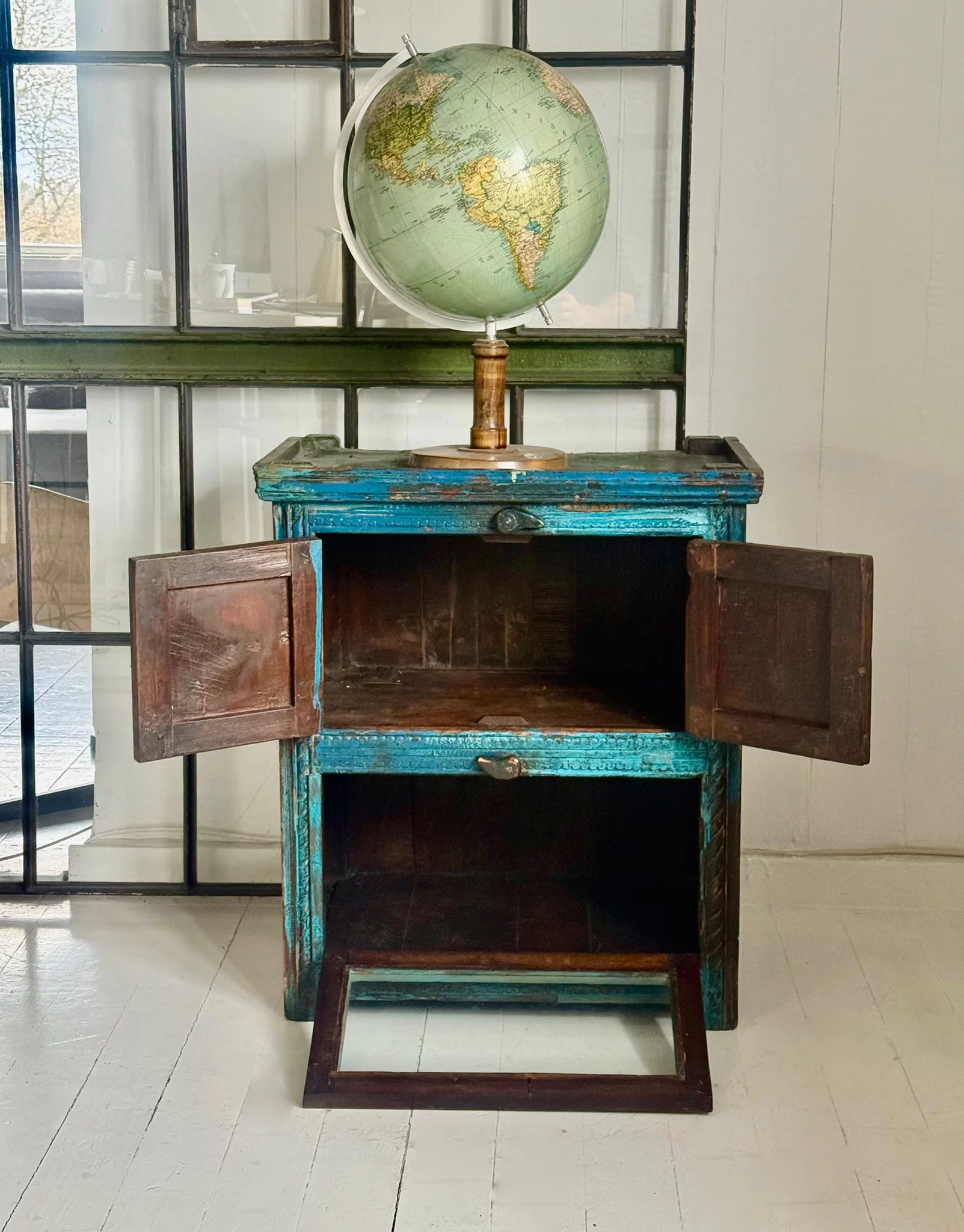 Fantastiskt vackert vintageskåp med arbetat trä och ljuvlig färg med patina.
